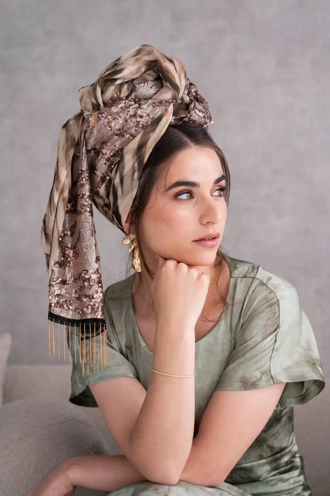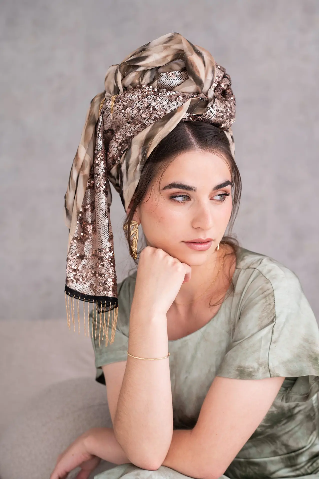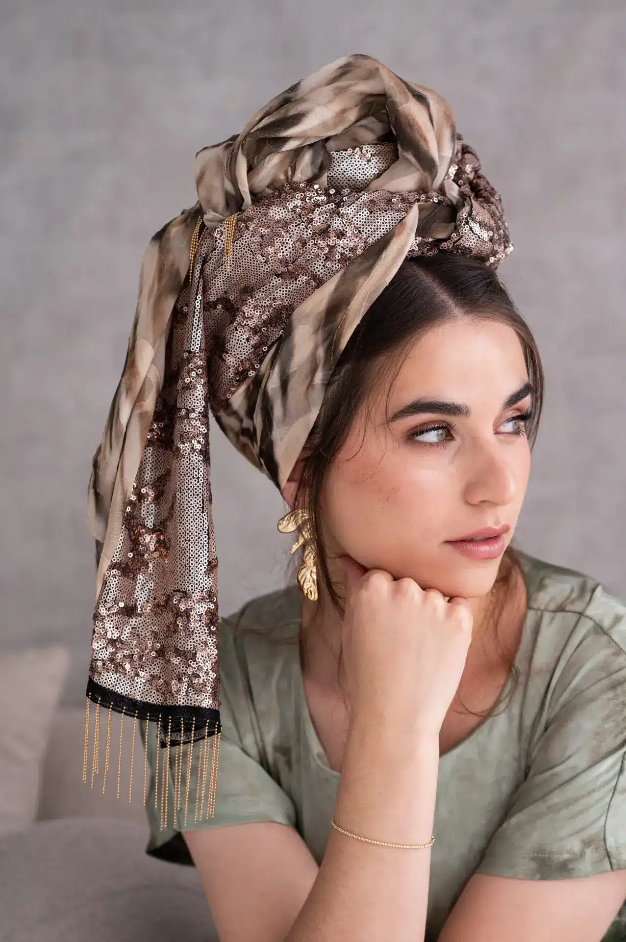 גווני ירוק, חום ושמנת בהדפס מופשט פייטים ברונזיים לאורכה בד נעים וקליל, לא מחליק נפח רך שמקבל כל קשירה מתאימה מאוד לבגדי חורף ואביב טובה לכיסוי חלקי או מלא עיצוב עם נוכחות שקטה מוסיפה טאץ' טבעי ומואר
