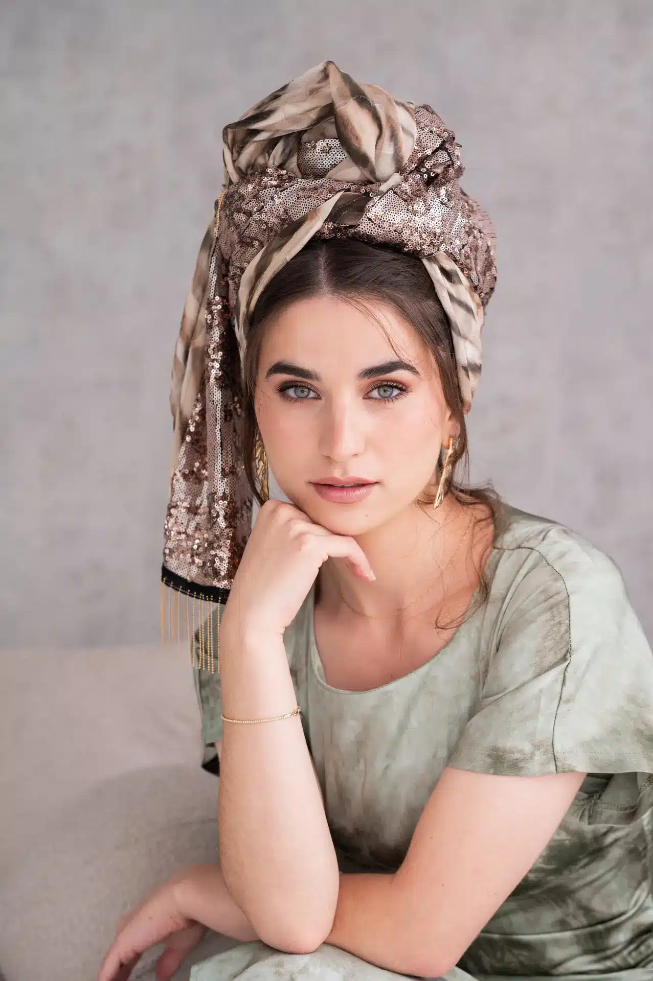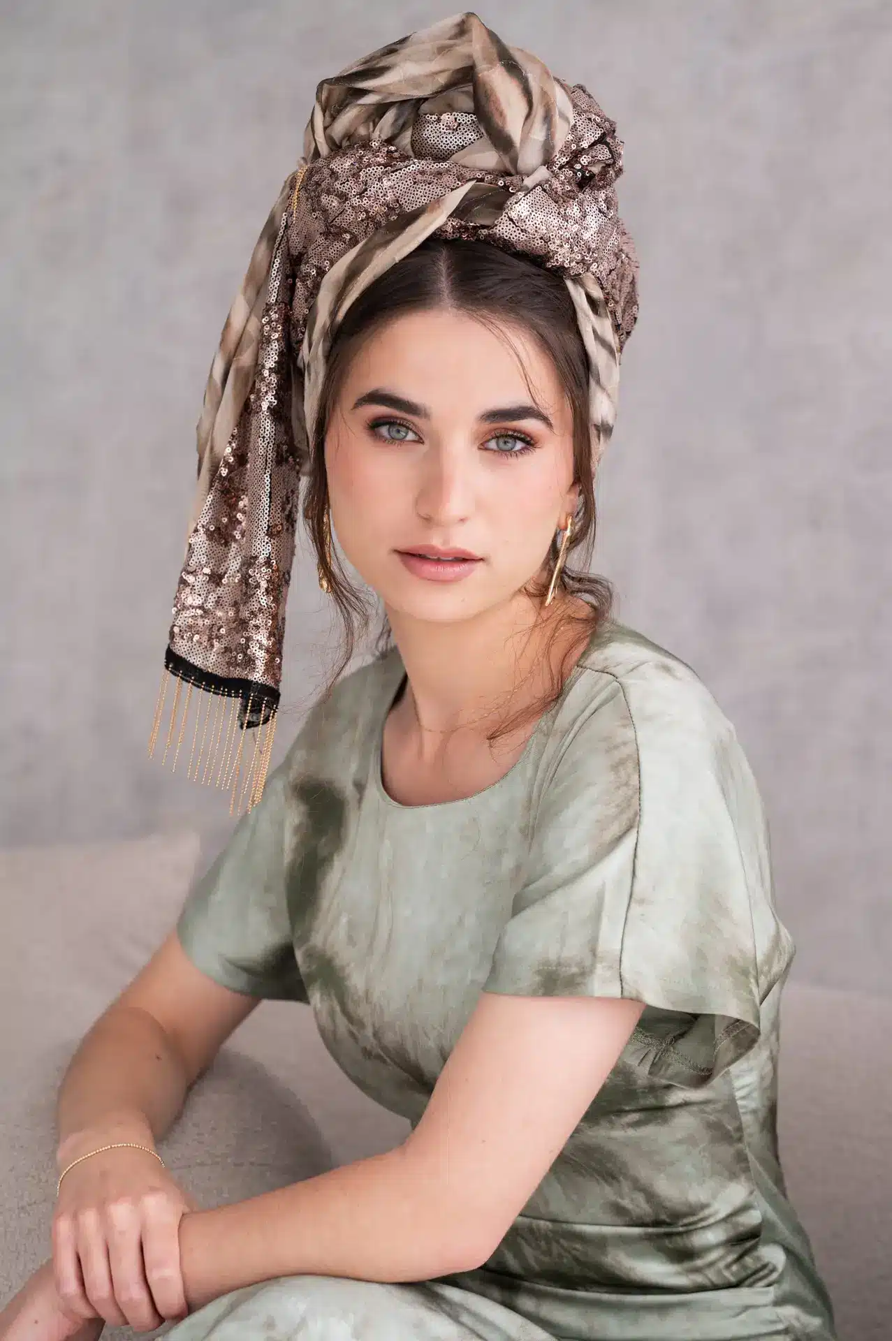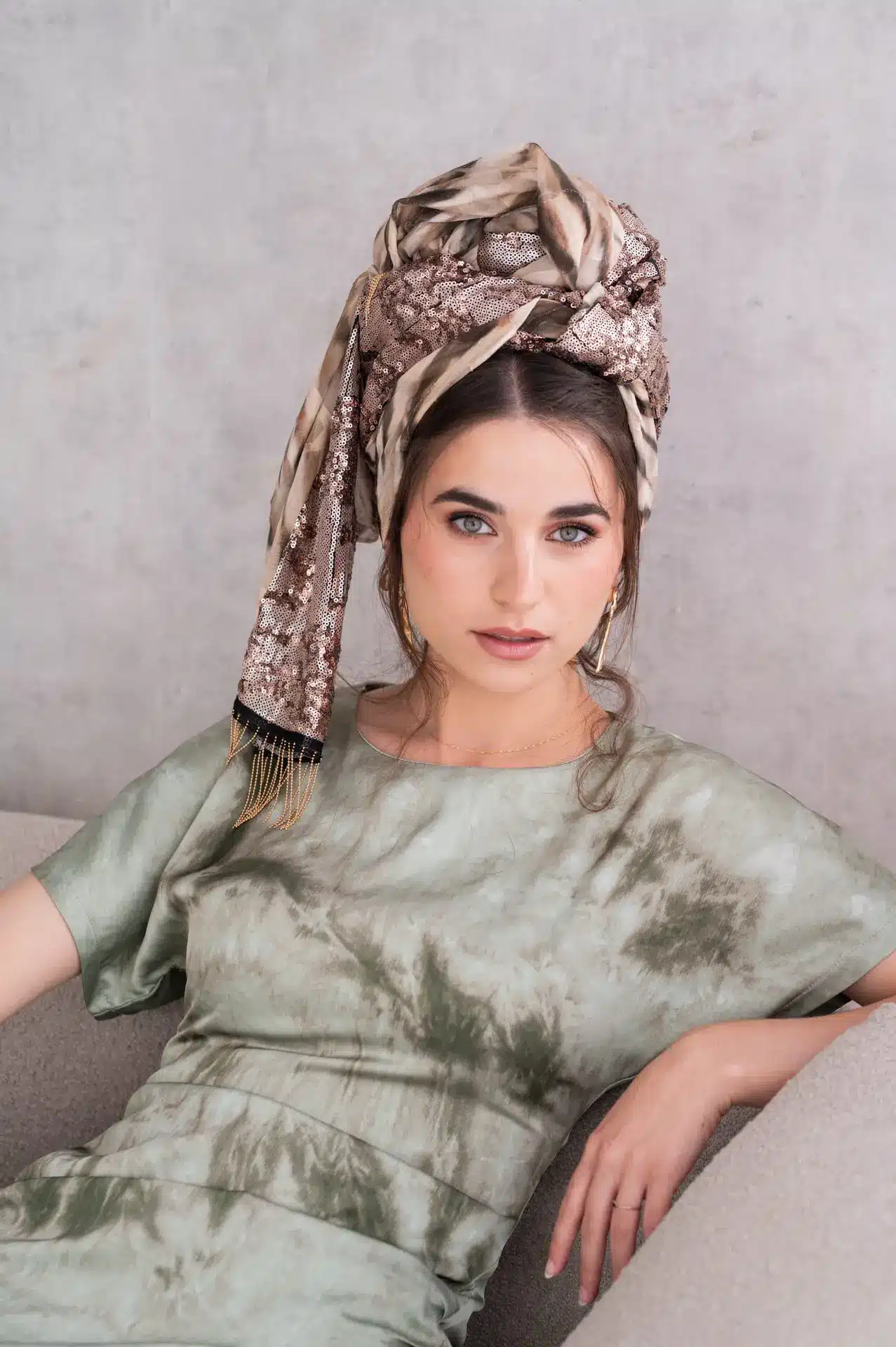 גווני ירוק, חום ושמנת בהדפס מופשט פייטים ברונזיים לאורכה בד נעים וקליל, לא מחליק נפח רך שמקבל כל קשירה מתאימה מאוד לבגדי חורף ואביב טובה לכיסוי חלקי או מלא עיצוב עם נוכחות שקטה מוסיפה טאץ' טבעי ומואר