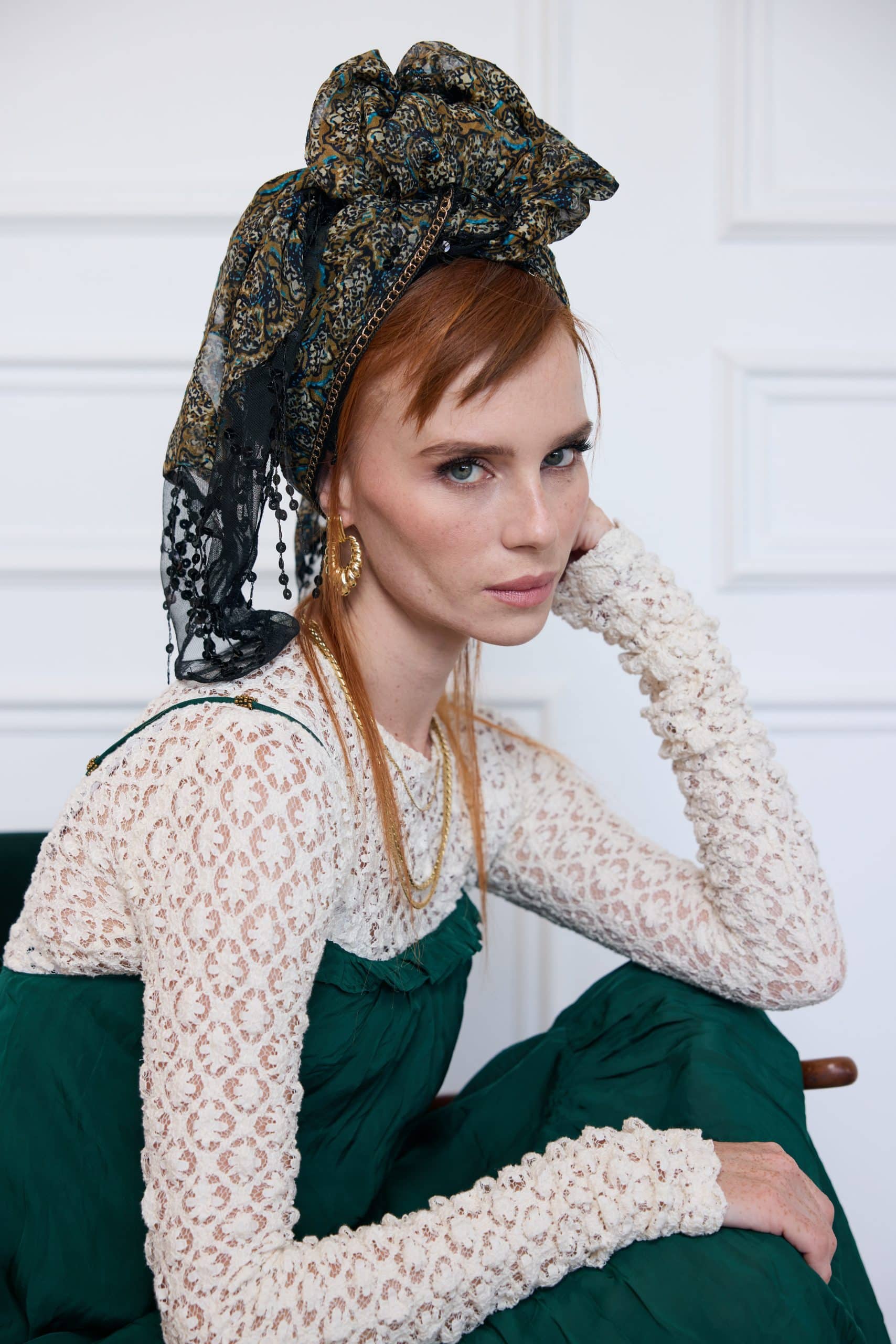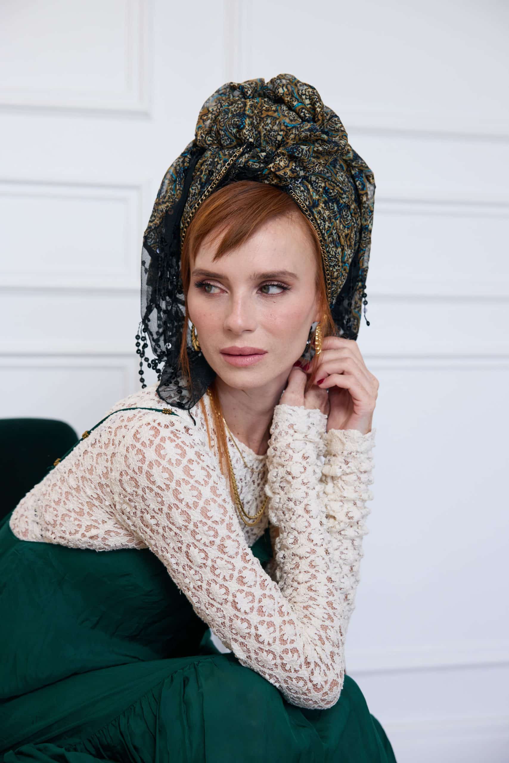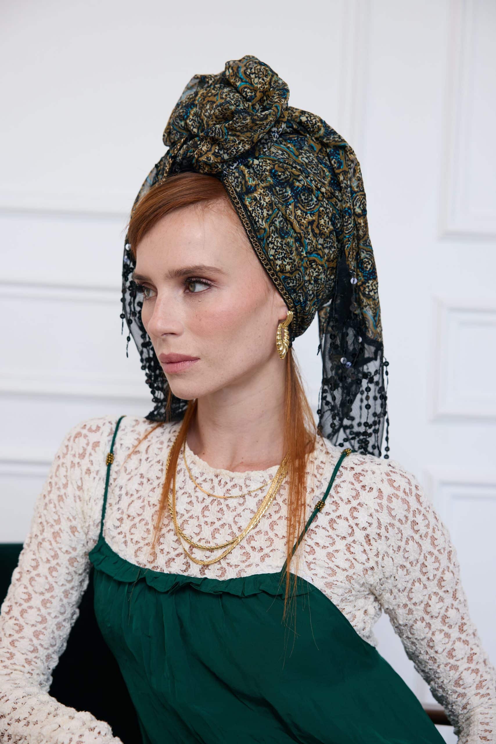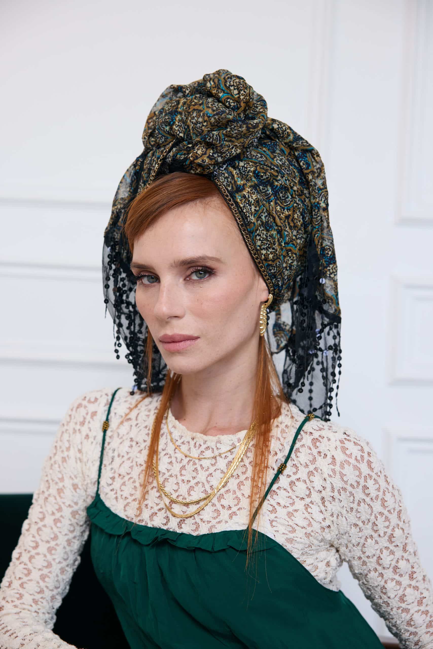הטבעות קטיפה עדינות על הבד המצויר מונעות ממנו להחליק ותכשיט זהב מהמם מקדימה נותן עוד שדרוג משמעותי ללוק הסופי .
