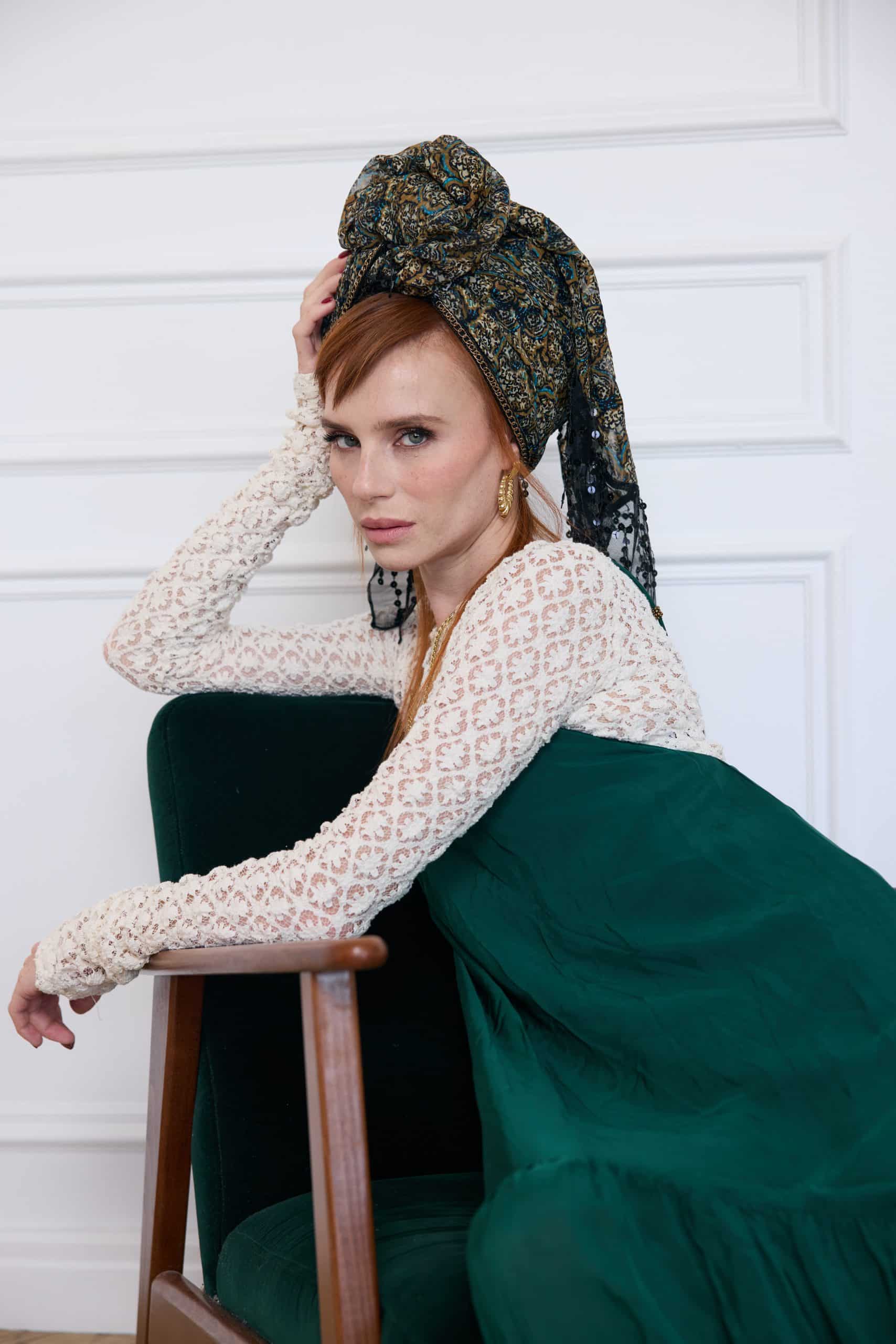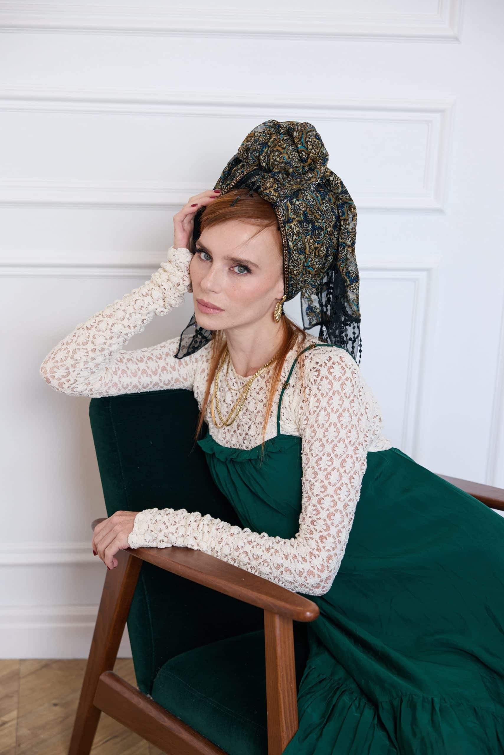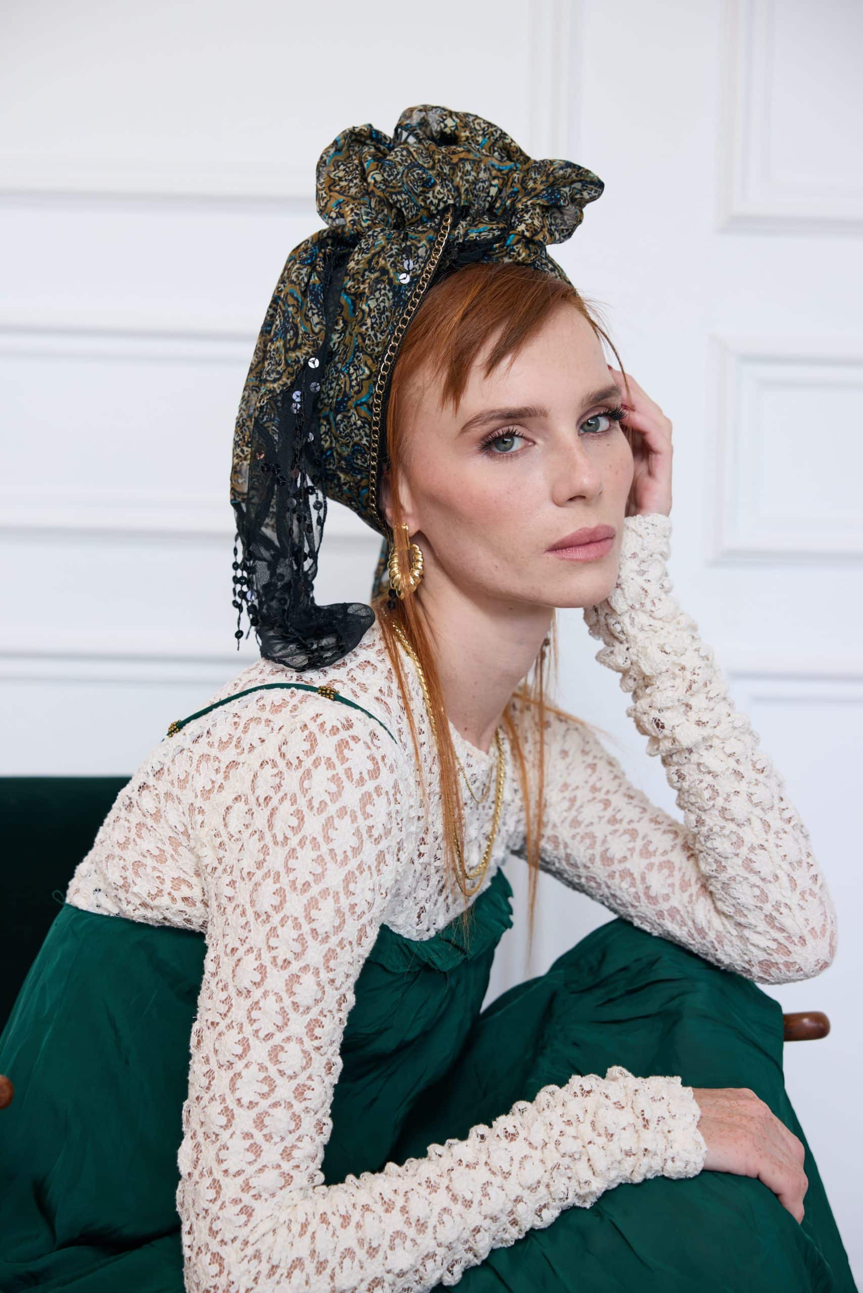 הטבעות קטיפה עדינות על הבד המצויר מונעות ממנו להחליק ותכשיט זהב מהמם מקדימה נותן עוד שדרוג משמעותי ללוק הסופי .