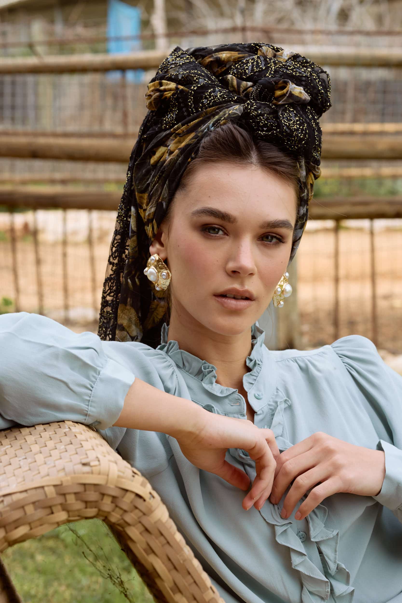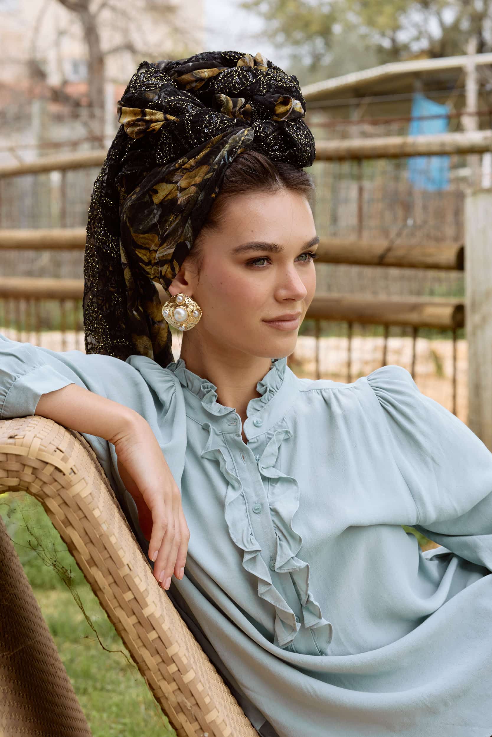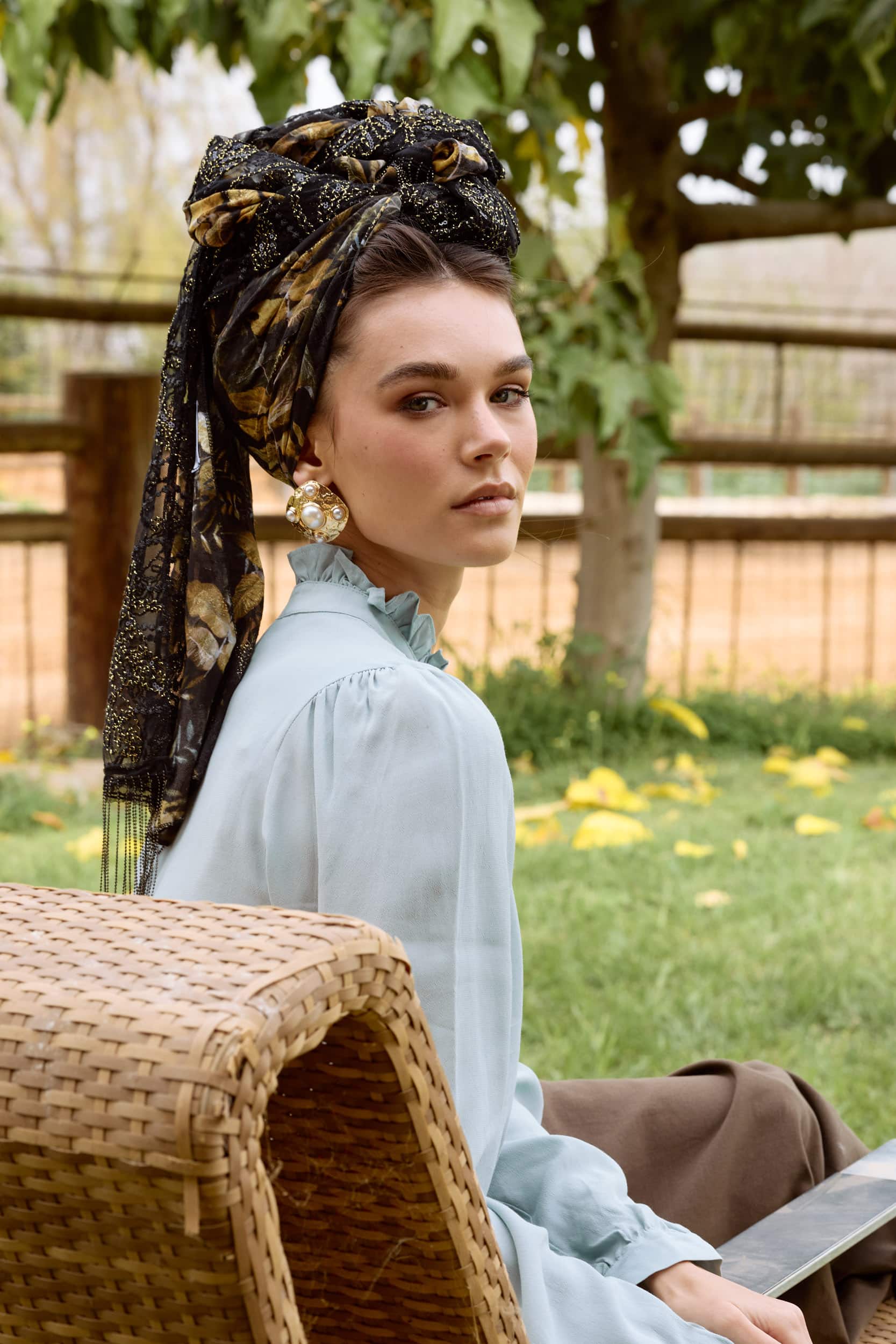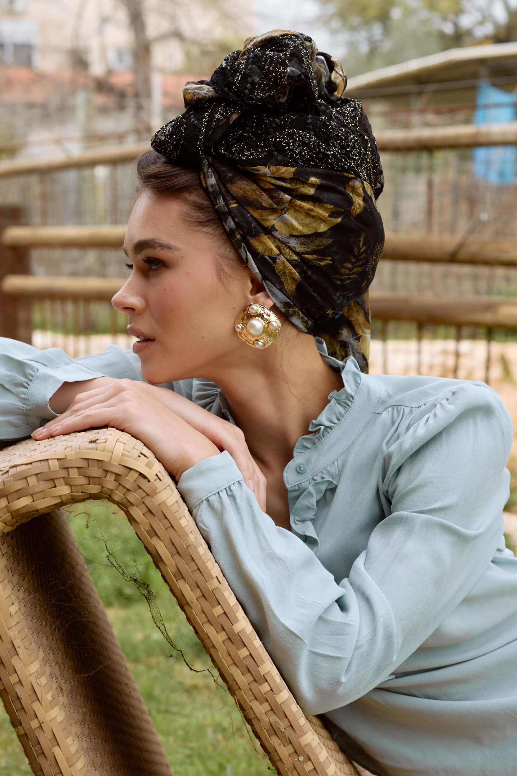 צעיף בהדפס עשיר בגווני שחור וזהב עם נגיעות פרחוניות עמוקות,